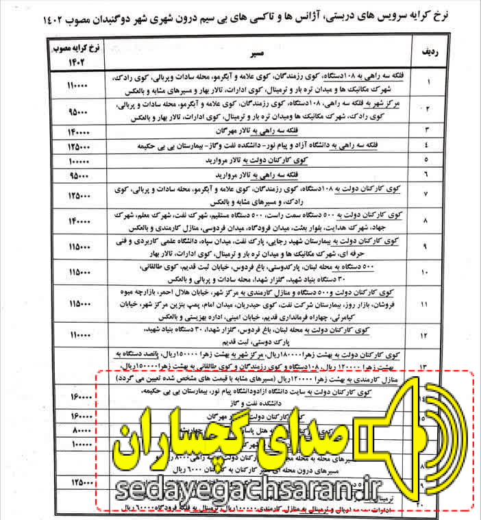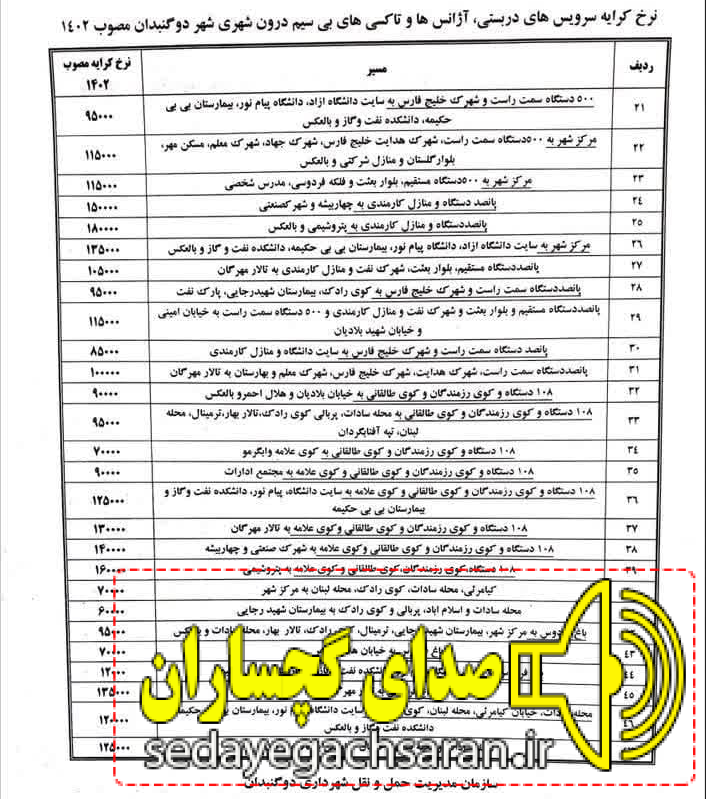 به گزارش صدای گچساران به نقل از ”صبح خرد”، نرخنامه تاکسیرانی این شهرستان درسال ۱۴۰۲ مصوب و منتشر شد. طبق قانون تمام تاکسی های گچساران ملزم به رعایت این نرخ نامه هستند.
