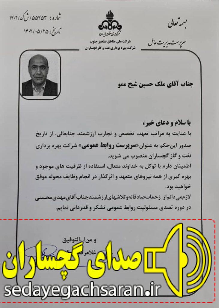صدای گچساران با حکم مهندس غلامرضا کمالی مدیرعامل شرکت بهره برداری نفت و گاز گچساران سرپرست جدید روابط عمومی نفت گچساران منصوب شد . بر اساس این حکم ملک حسین شیخممو رییس روابط عمومی نفت گچساران شد.