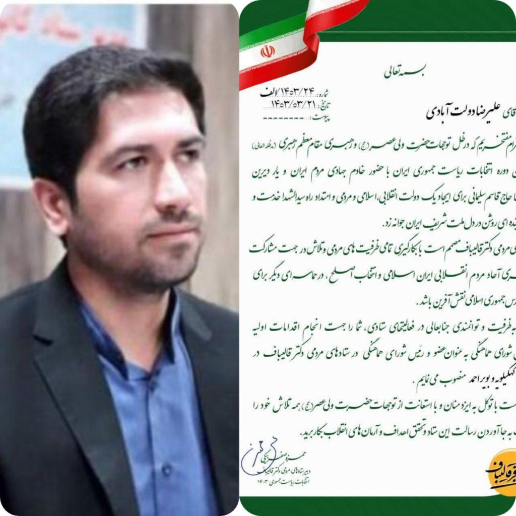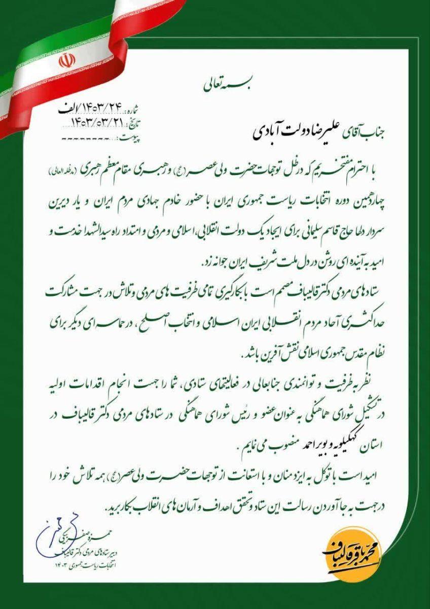 در حکمی که به امضای حمزه صفربیگی دبیر ستادهای مردمی دکتر قالیباف رسیده آمده است: نظر به ظرفیت و توانمندی جنابعالی در فعالیتهای ستادی شما را به جهت انجام اقدامات اولیه در تشکیل شورای هماهنگی به عنوان عضو و رئیس شورای هماهنگی در ستادهای مردمی دکتر قالیباف در استان کهگیلویه و بویراحمد منصوب مینمایم.