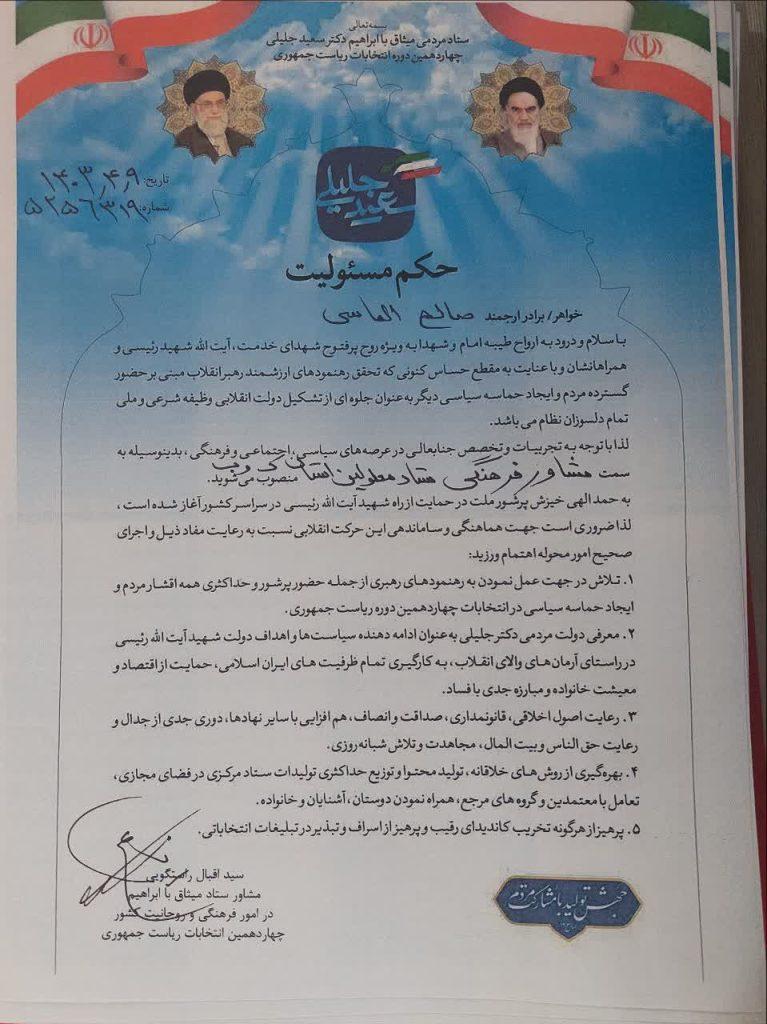به گزارش پایگاه خبری صدای گچساران با حکم سید اقبال راستگویی صالح الماسی معلول گچسارانی به عنوان مشاور فرهنگی معلولین استان کهگیلو براحمد در ستاد سعید جلیلی در انتخابات ریاست جمهوری منصوب شد.